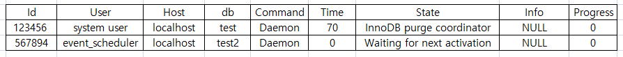* information_schema.PROCESSLIST 테이블 또는 mysqladmin processlist 명령을 통해서도 확인 가능