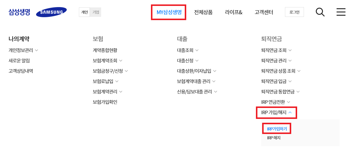2. MY삼성생명 - IRP 가입/해지 - IRP 가입하기