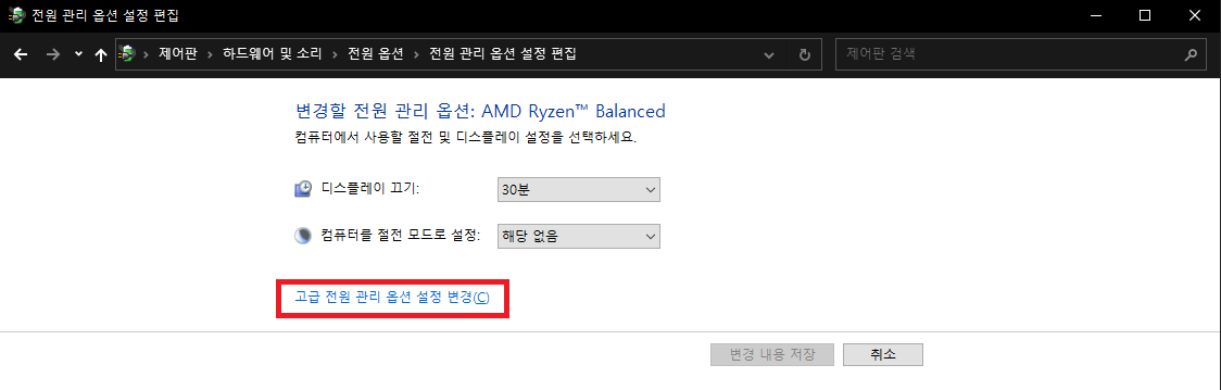 2. 디스플레이를 끄는 시간 설정 - 고급 전원 관리 옵션 설정 변경