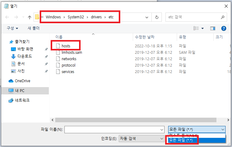 3. 모든 파일로 검색 후 hosts 파일 열기